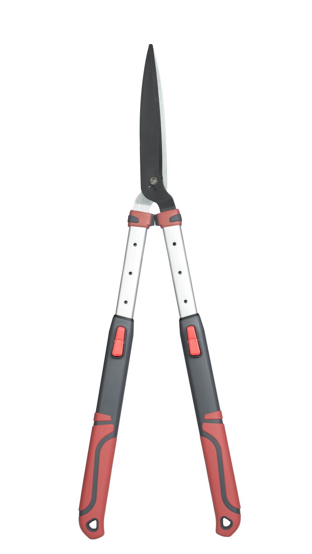 This telescopic hedge shear features easy shaft length adjustment and extended reach, with a lightweight plastic outer shaft for improved handling.